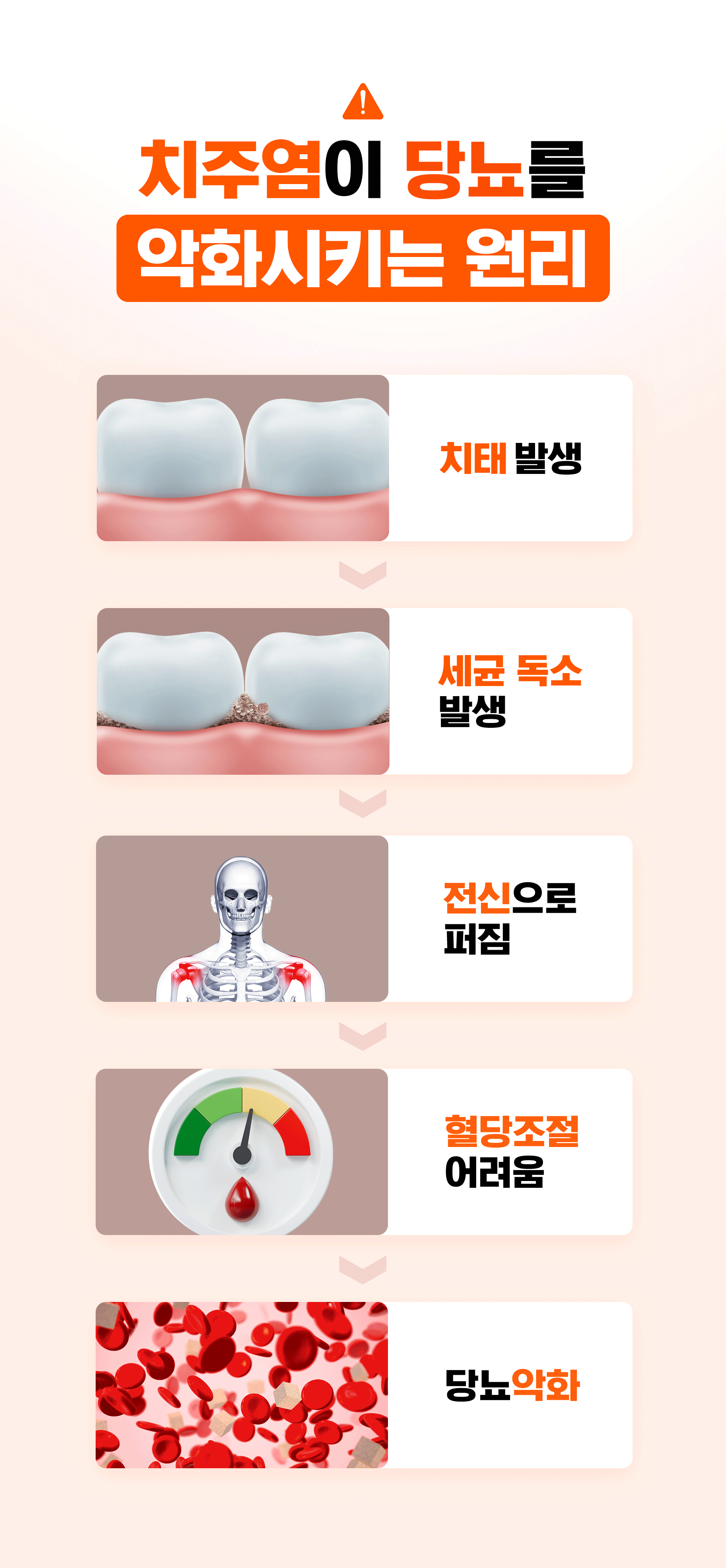 | 혈당 상승 → 독성물질(AGEs) 생성 | 혈당이 높으면 ‘AGEs’라는 독성 단백질이 생겨 염증과 노화를 촉진함 | 잇몸세포가 손상되고 염증 반응이 쉽게 발생 |