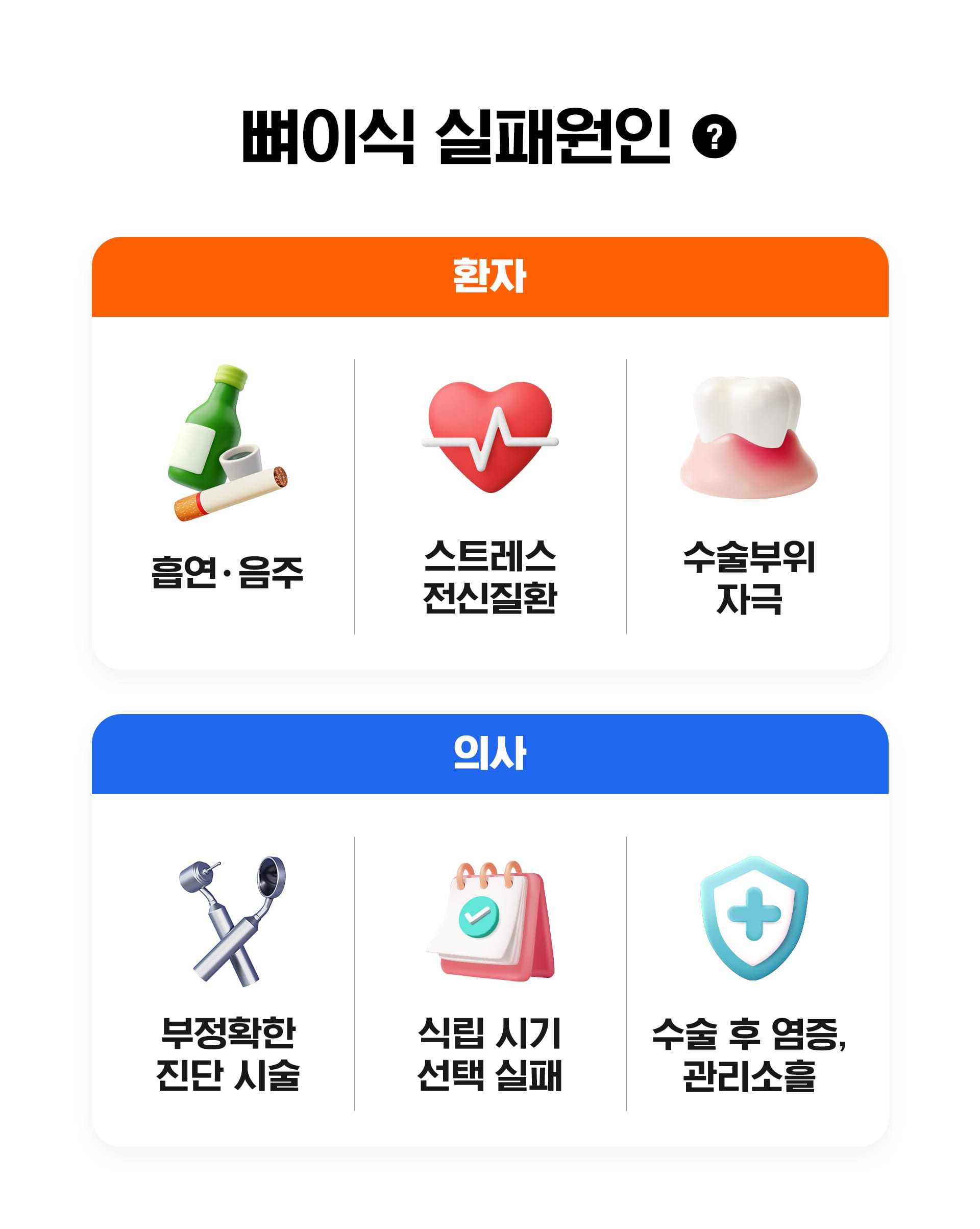- 부적절한 시기: 뼈 회복 전 무리한 즉시 식립 → 실패 원인