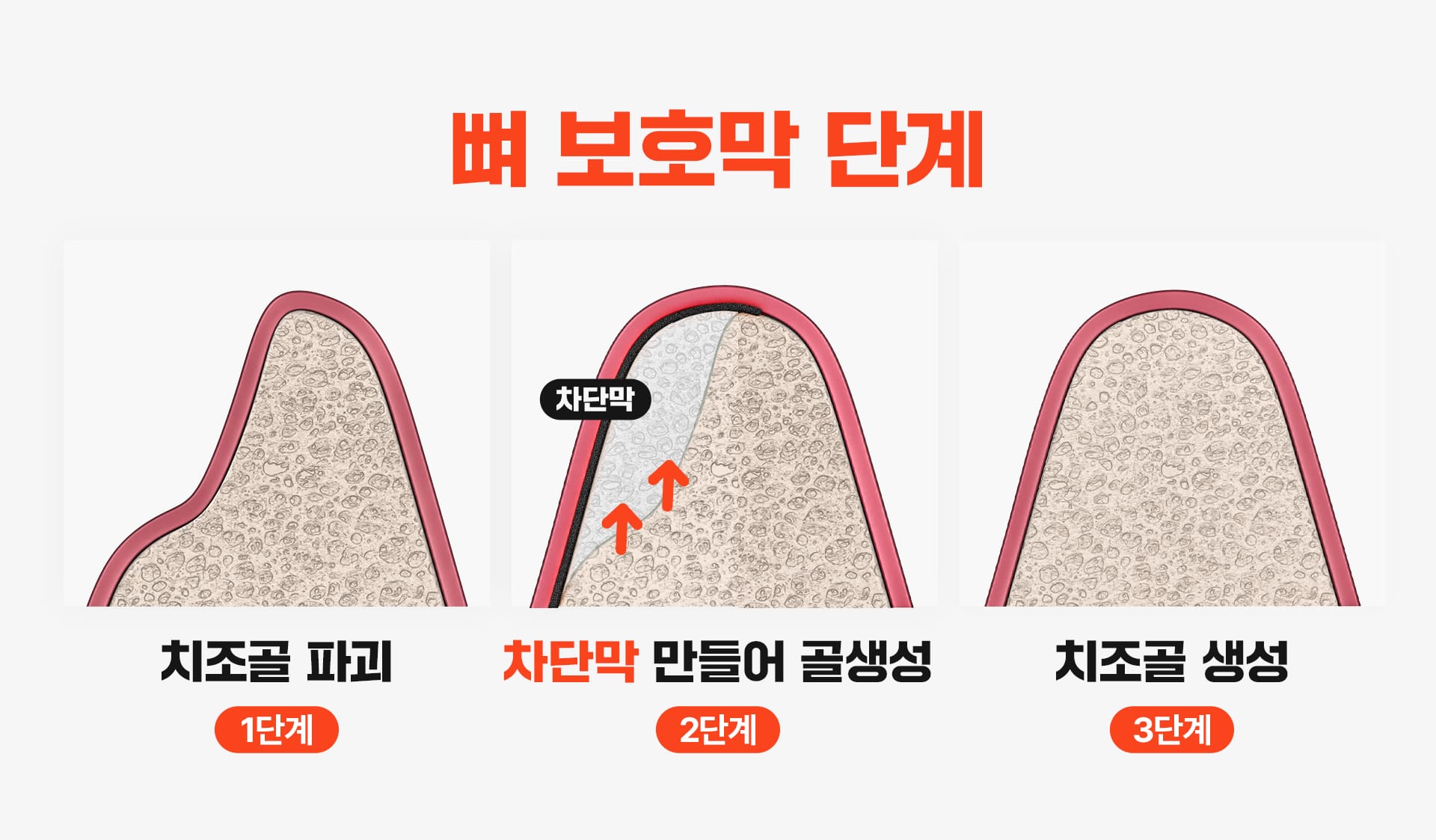 뼈가 자라야 할 곳에 특수 막을 씌워서 잇몸 세포가 먼저 자라지 않고, 뼈 세포가 충분히 자랄 시간을 벌어줍니다.