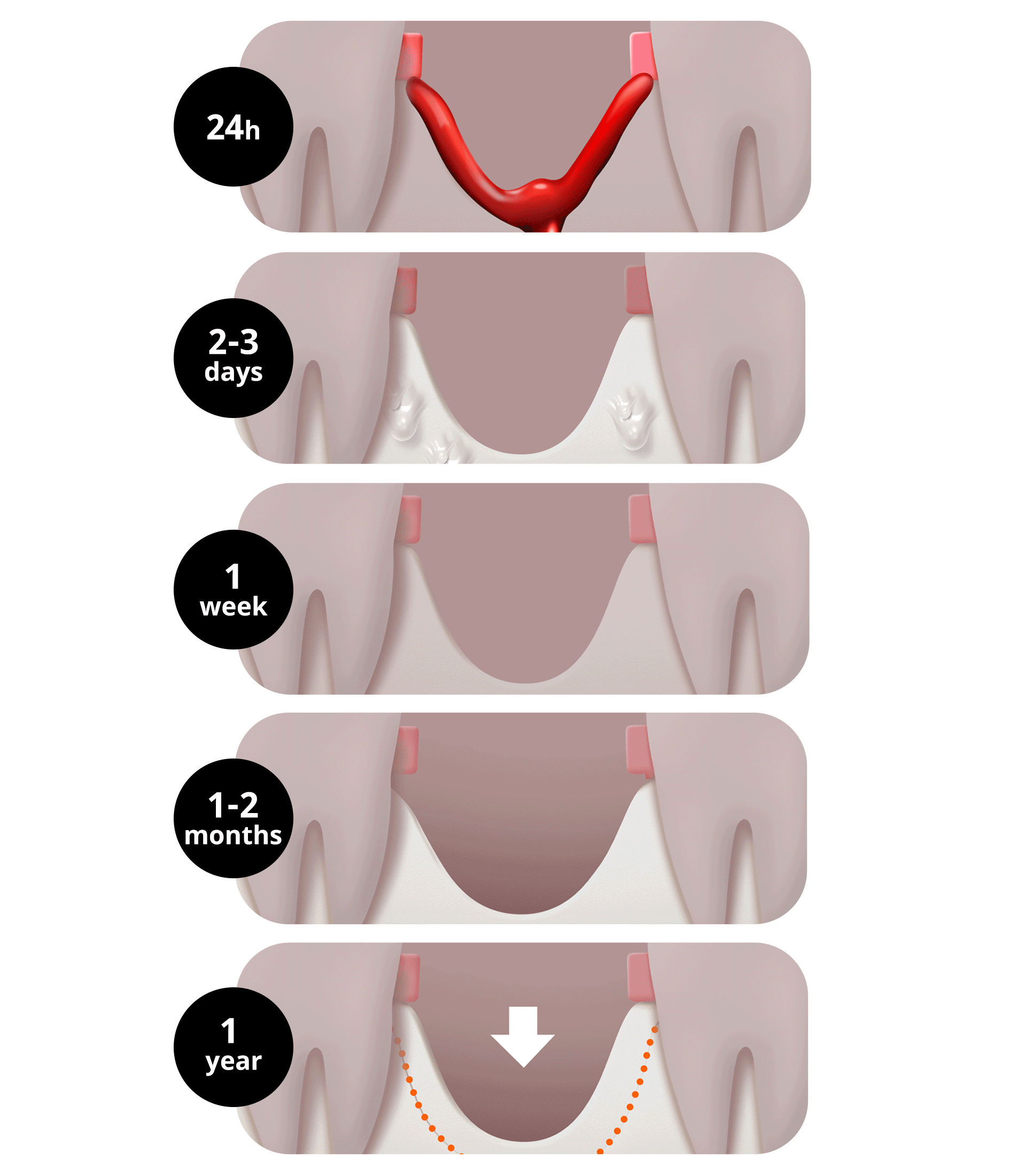 - 새로운 뼈가 조금씩 만들어지기 시작하지만, 이는 완전한 뼈가 아니므로 치조골의 높이와 폭은 계속 줄어듭니다